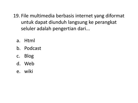 6. file multimedia berbasis internet yang di format untuk dapat di unduh langsung ke perangkat seluler adalah pengertian dari...a.blogb.htmlc.podcastd.wikie.web
